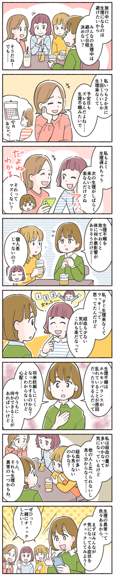 生理不順などの生理の異常は、日常に支障がない限りは、別にいいか・・・と放置してしまう人も少なくないと思います。